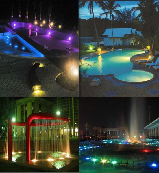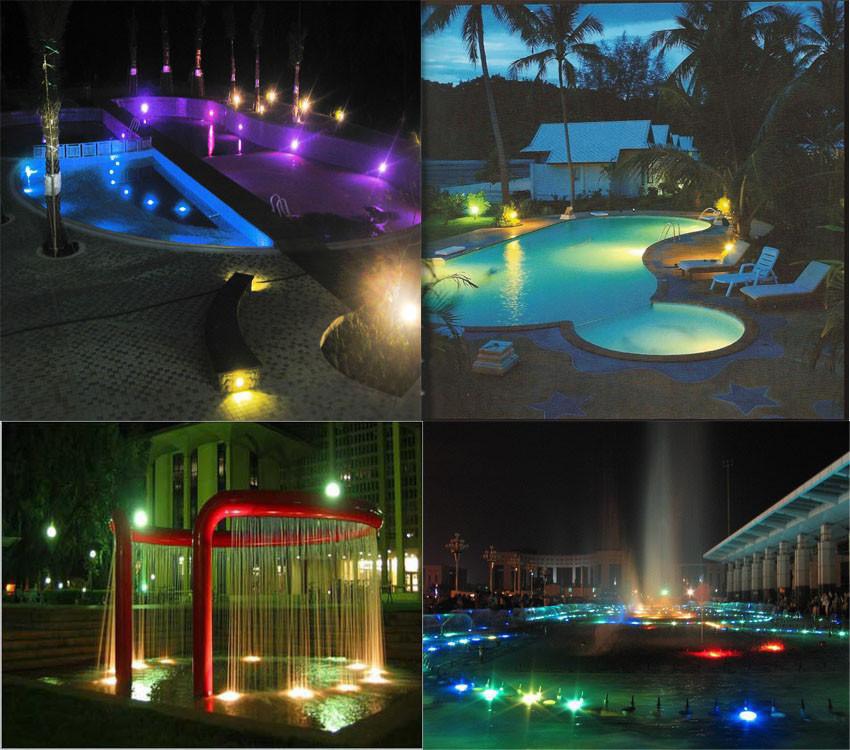 Ứng dụng tạo hiệu ứng ánh sáng và điểm nhấn cho không gian trong đài phun nước, hòn non bộ, trong các công trình ngoài trời và trong nhà. Đèn còn được sử dụng để gắn trong các bể bơi hòn non bộ, bể cá. Với nhiều màu sắc khác nhau, tạo ra sự phản xạ pha trộn về màu sắc và hiệu ứng ánh sáng đẹp.