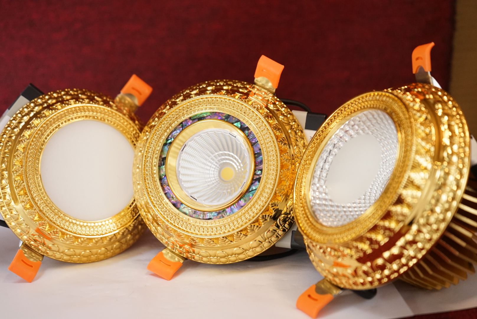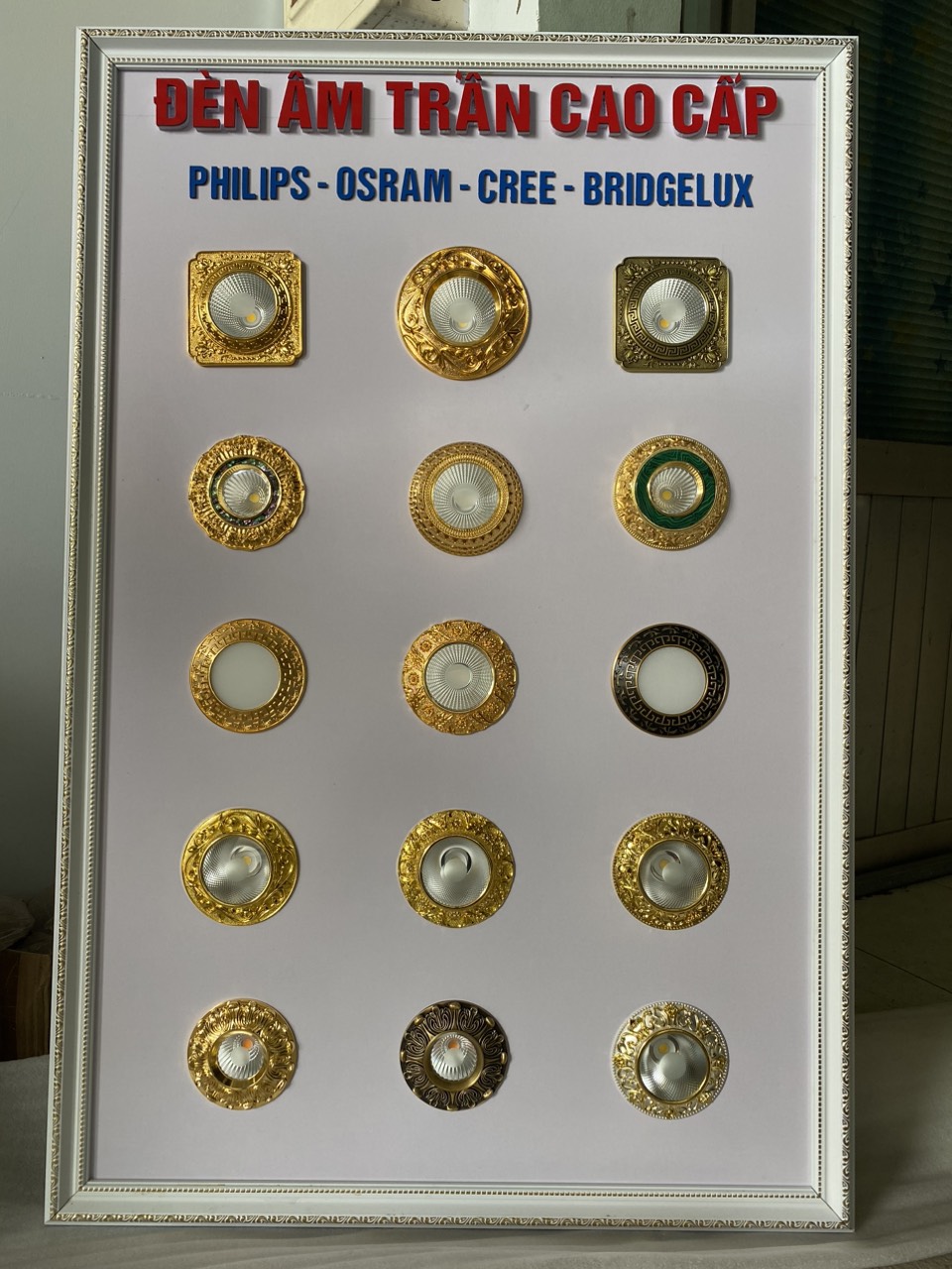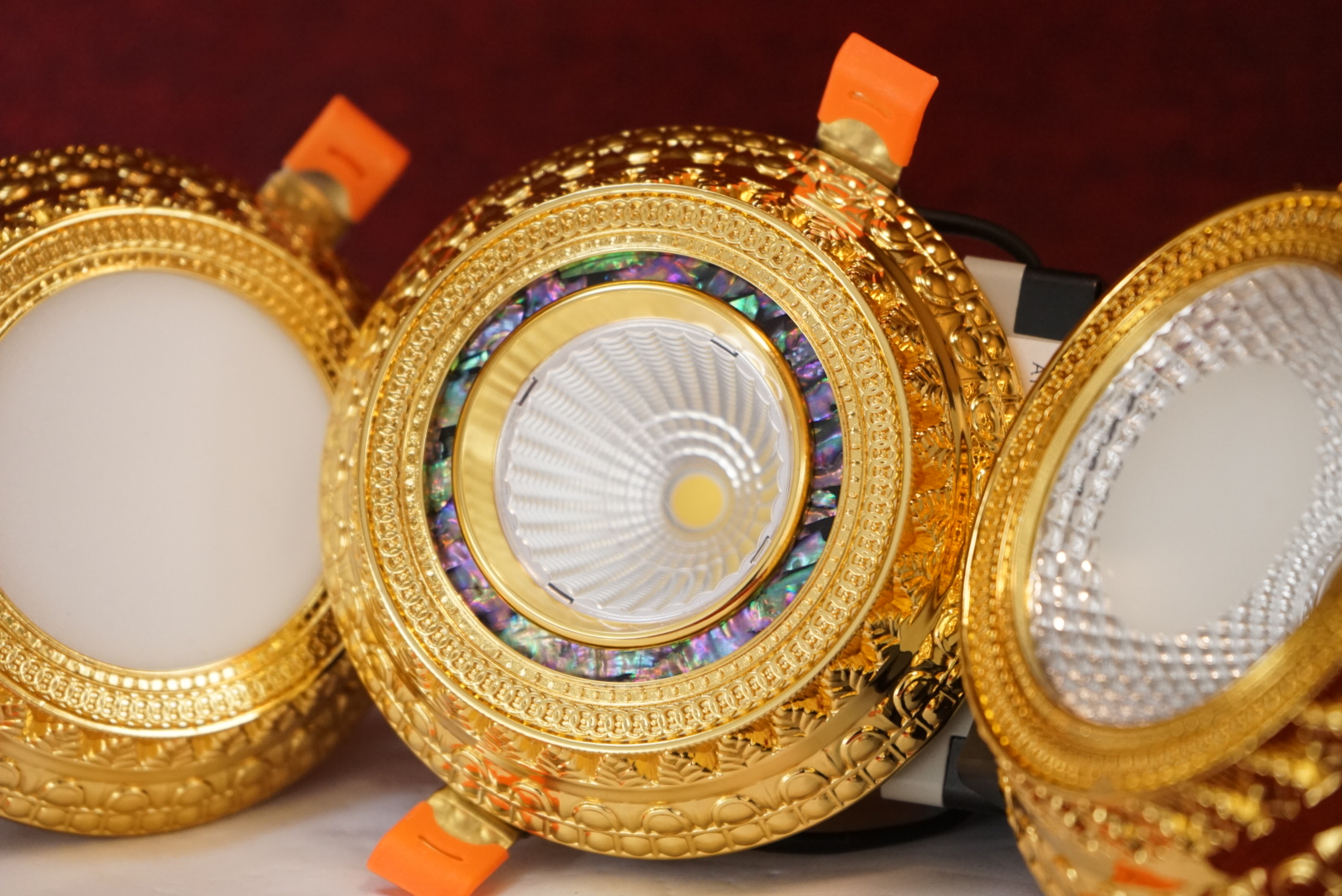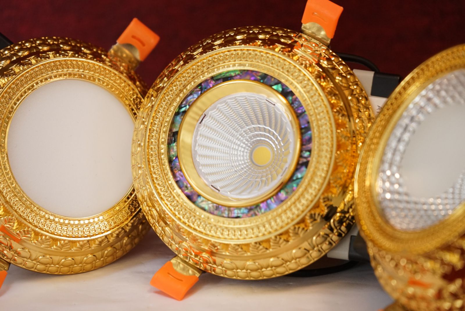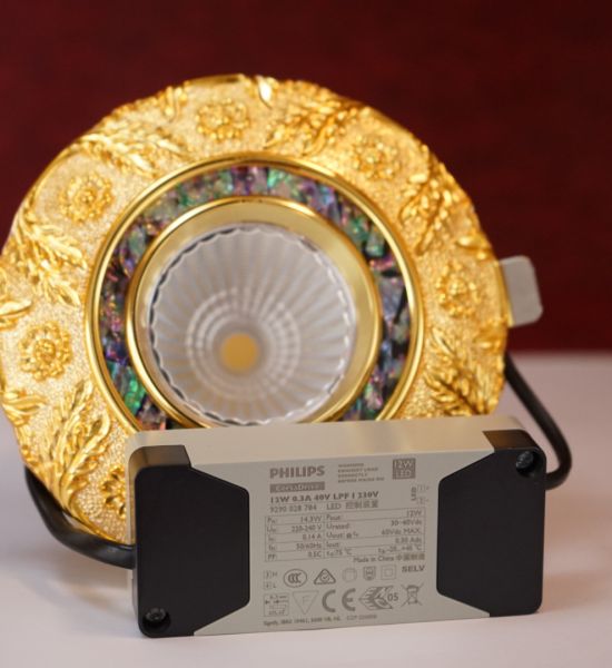 Phía sau phần mặt đèn là chóa đèn nơi được gắn chip led và nó được làm từ chất liệu PC thấu quang chống lóa, mỏi mắt hiệu quả. Ngoài ra còn có các mẫu đèn led downlight cổ điển với chóa đèn khảm đá khổng tước và đá ngọc trai rất ấn tượng