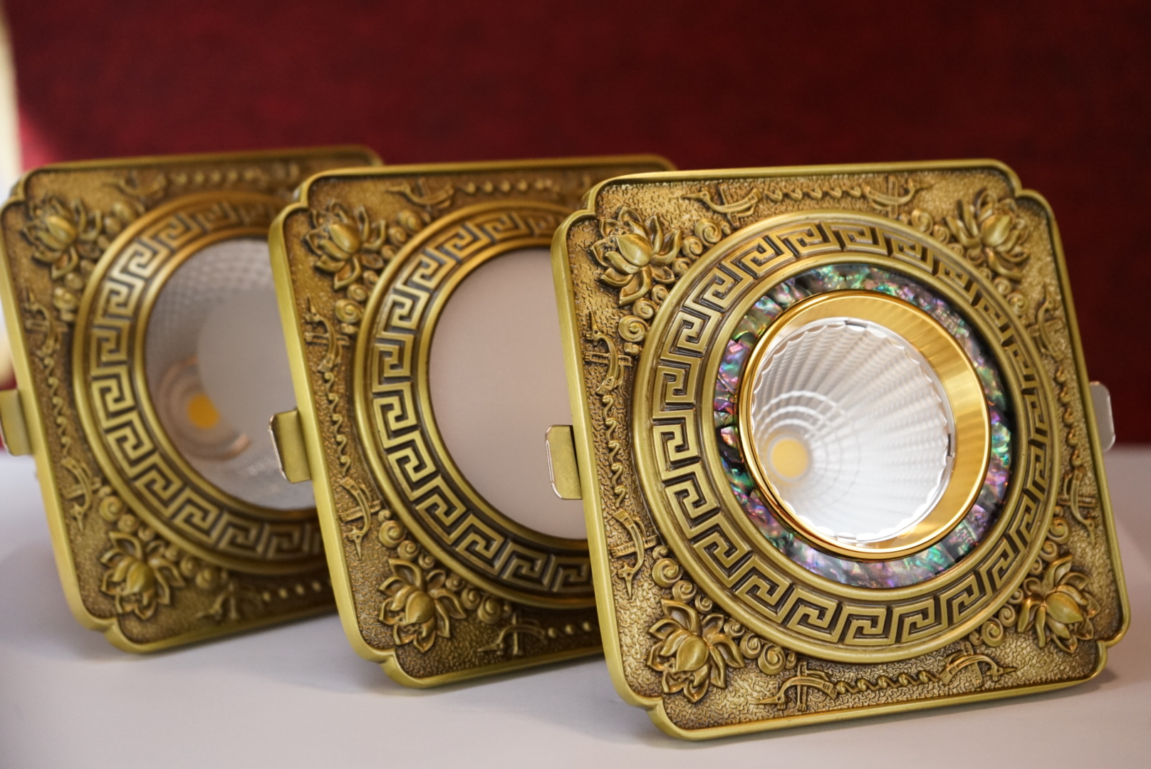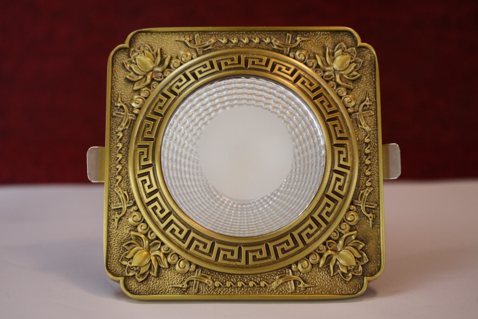 Mặt đèn chính là điểm khác biệt ấn tượng mà bạn dễ dàng trông thất nhất khi tìm mua các mẫu đèn led âm trần cổ điển này. Nó được thiết kế tinh xảo đến từng chi tiết nhỏ. Chất liệu cấu tạo nên phần mặt đèn là đồng nguyên khối được đúc tỉ mỉ và chạm khắc những họa tiết hoa văn tinh tế. Có thể là hoa lá, cũng có thể là các linh vật.